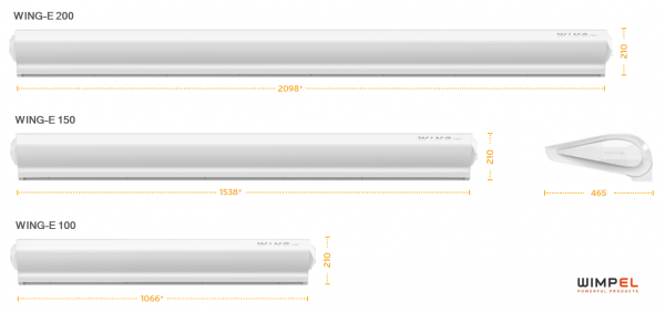 Wing-E er en serie luftporter med elektriske varmebatteri. Wing-E er markedets mest stillegående luftporter og ny design på motor og vifte sparer opp til 40% av energien sammenlignet med konvensjonelle løsninger. Takket være en helt ny tekonologi har Wing-E serien lav driftstemperatur samtidig som den opererer med høy effekt. Dette sikrer stabil og energiøkonomisk drift. Asymmetrisk distribusjon av varmeeffekt gjør disse luftportene enkle å tilpasse til kundens behov.